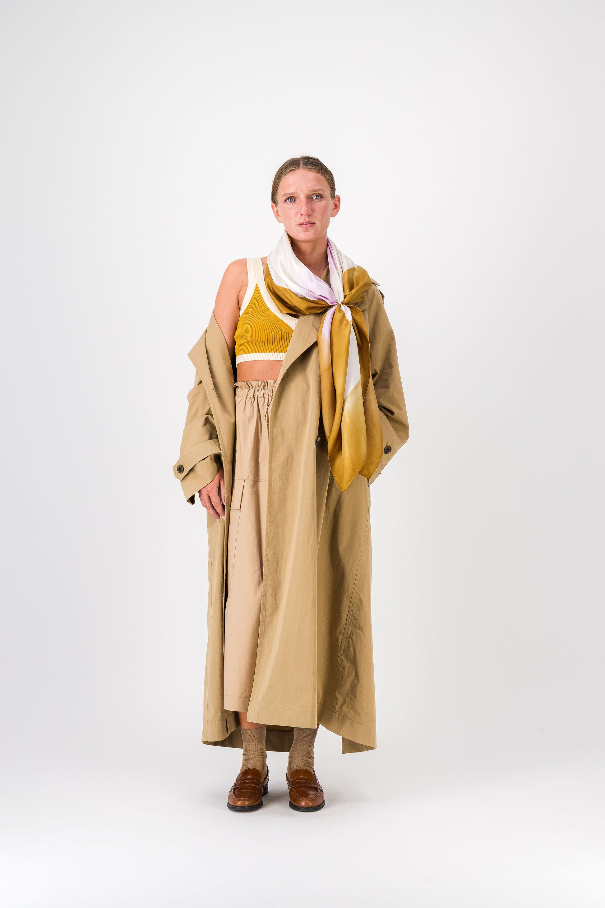 Réalisé en twill de soie 100 %, le carré AIRE révèle un motif géométrique aux couleurs vibrantes, obtenu grâce à un procédé de teinture artisanal.