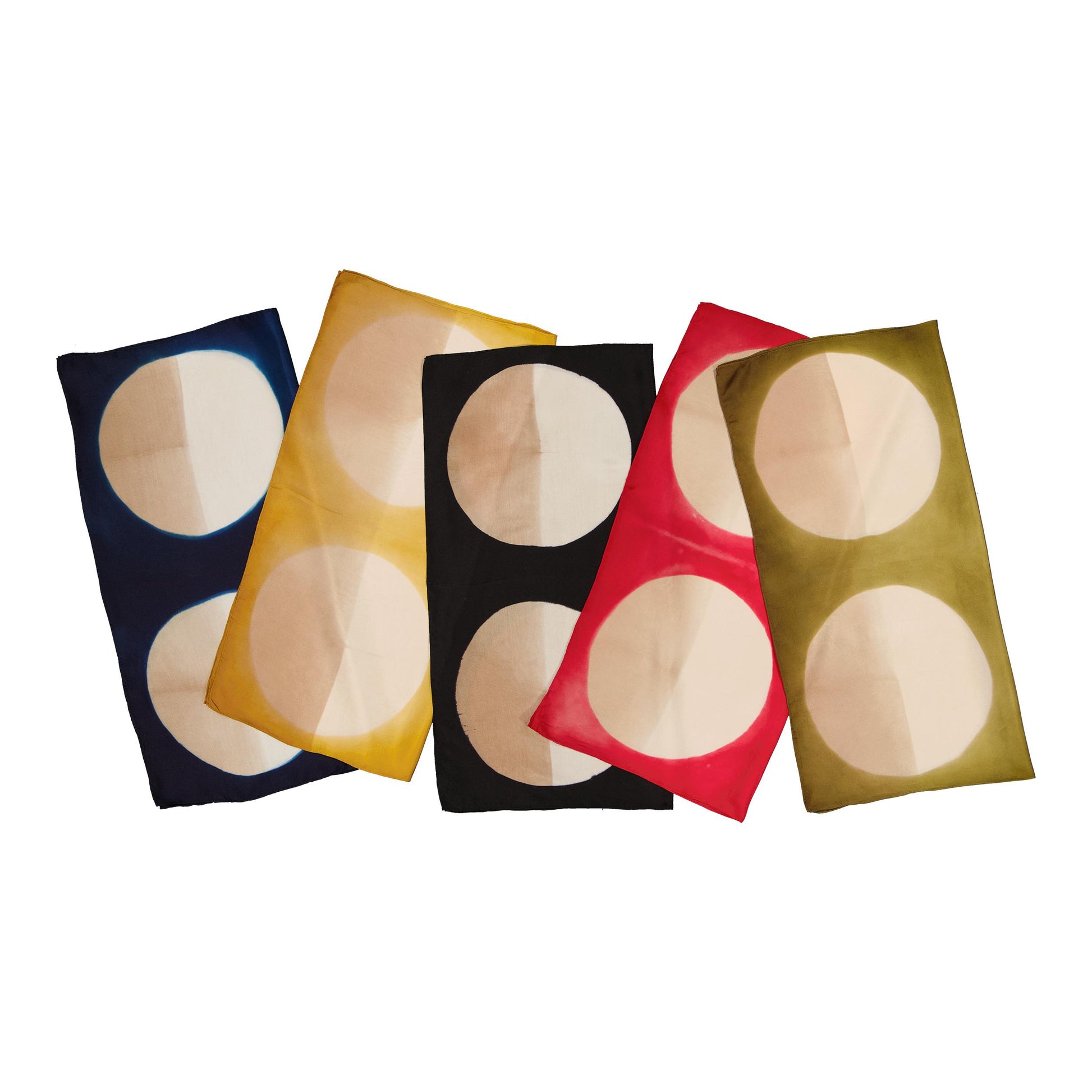 "ASTRE", bandana en twill de soie au motif lunaire et aux coloris profonds. Créé en teinture artisanale, selon la technique japonaise "itajime". Chaque dessin est unique. Roulotté main.