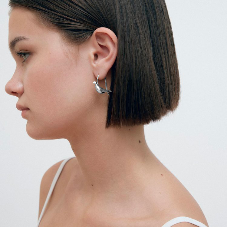 Les boucles d’oreilles Dove sont fabriquées à la main en argent sterling. Les deux oiseaux se balancent élégamment au rythme des mouvements et rendent hommage aux célèbres boucles d’oreilles hellénistiques en forme de colombe, aujourd’hui conservées dans la collection du Met Museum. Dans la Grèce antique, plusieurs oiseaux étaient sacrés pour Aphrodite. Les colombes symbolisaient l’amour et la tendresse, et les bijoux les représentant étaient offerts comme gages d’amour.