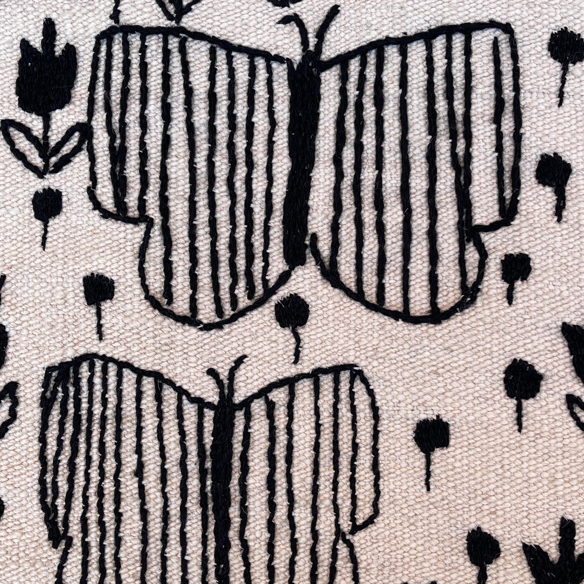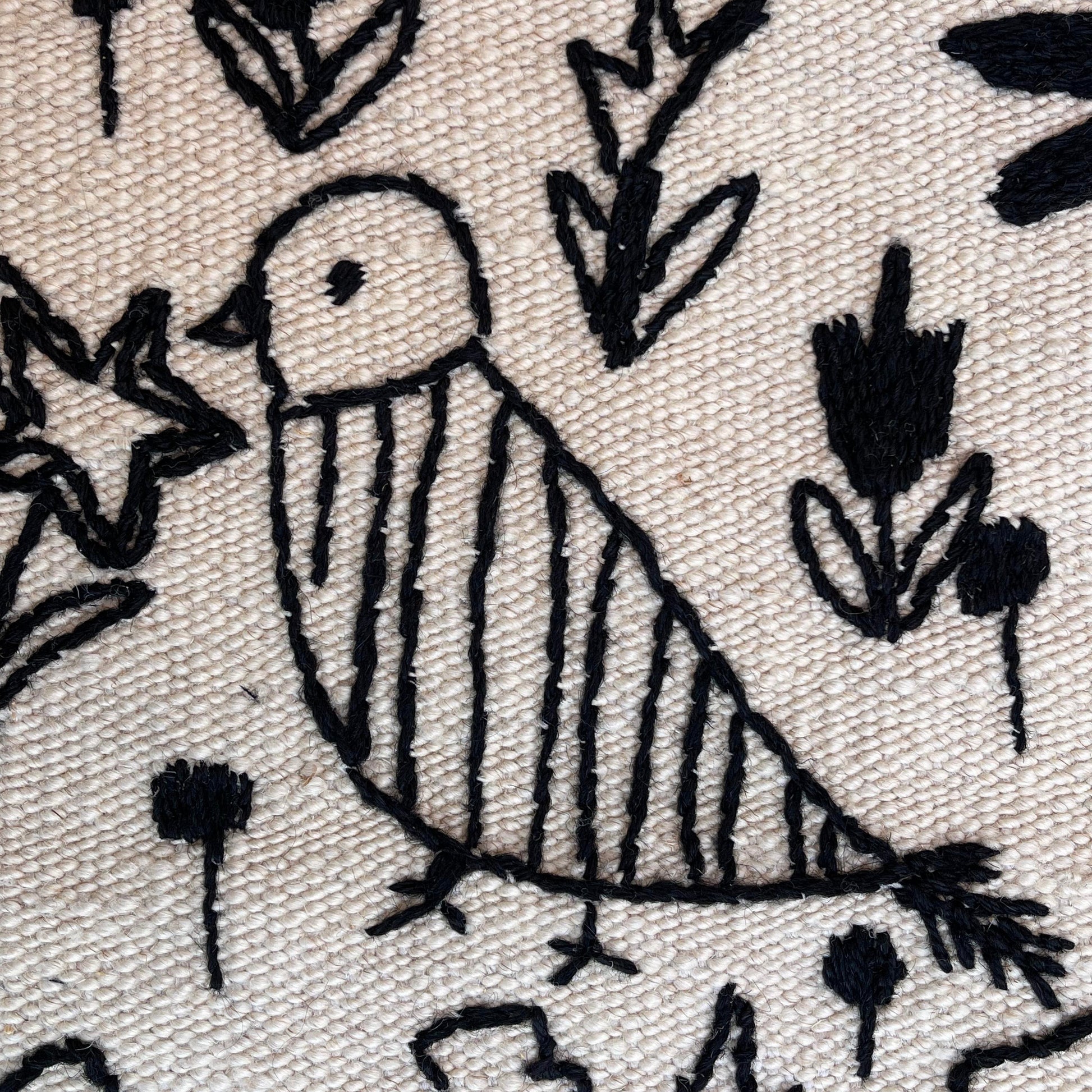 Une broderie de laine aux dessins naïfs et tendres, oiseaux, maisons, puits, papillons...