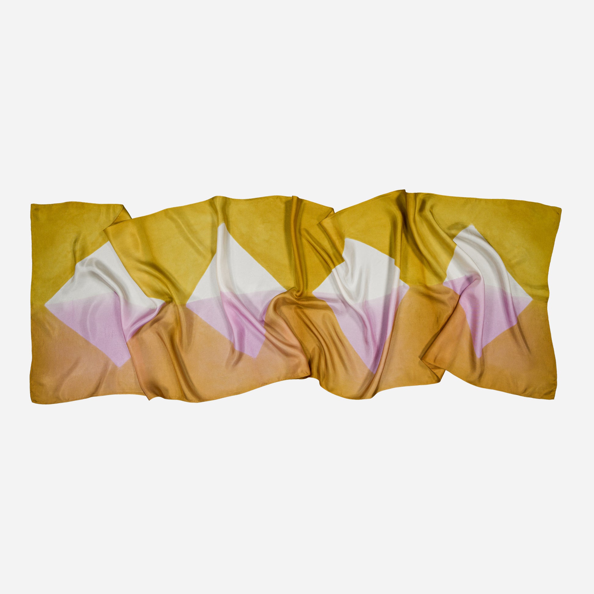"ORIGAMI", Une étole taillée dans un luxueux twill de soie. Teint et roulotté main. Motif abstrait aux coloris profonds.