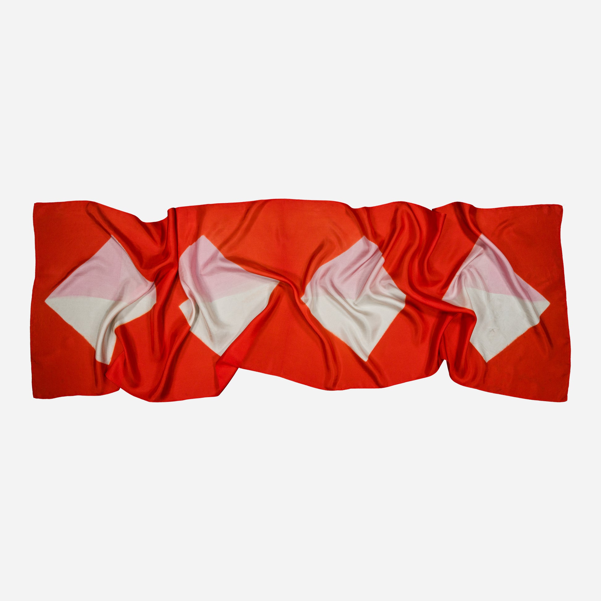 "ORIGAMI", Une étole taillée dans un luxueux twill de soie. Teint et roulotté main. Motif abstrait aux coloris profonds.