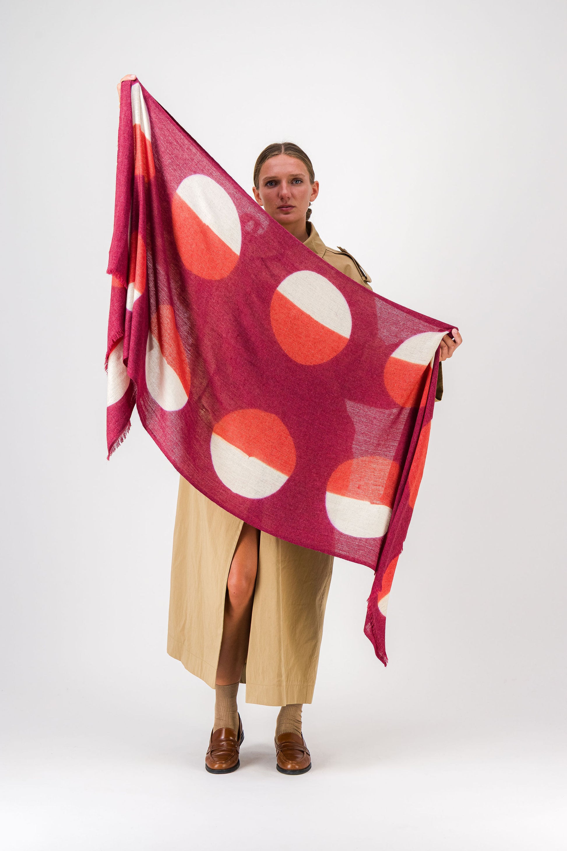 « PARADE », une écharpe en mérinos aux motifs de pois surdimensionnés.