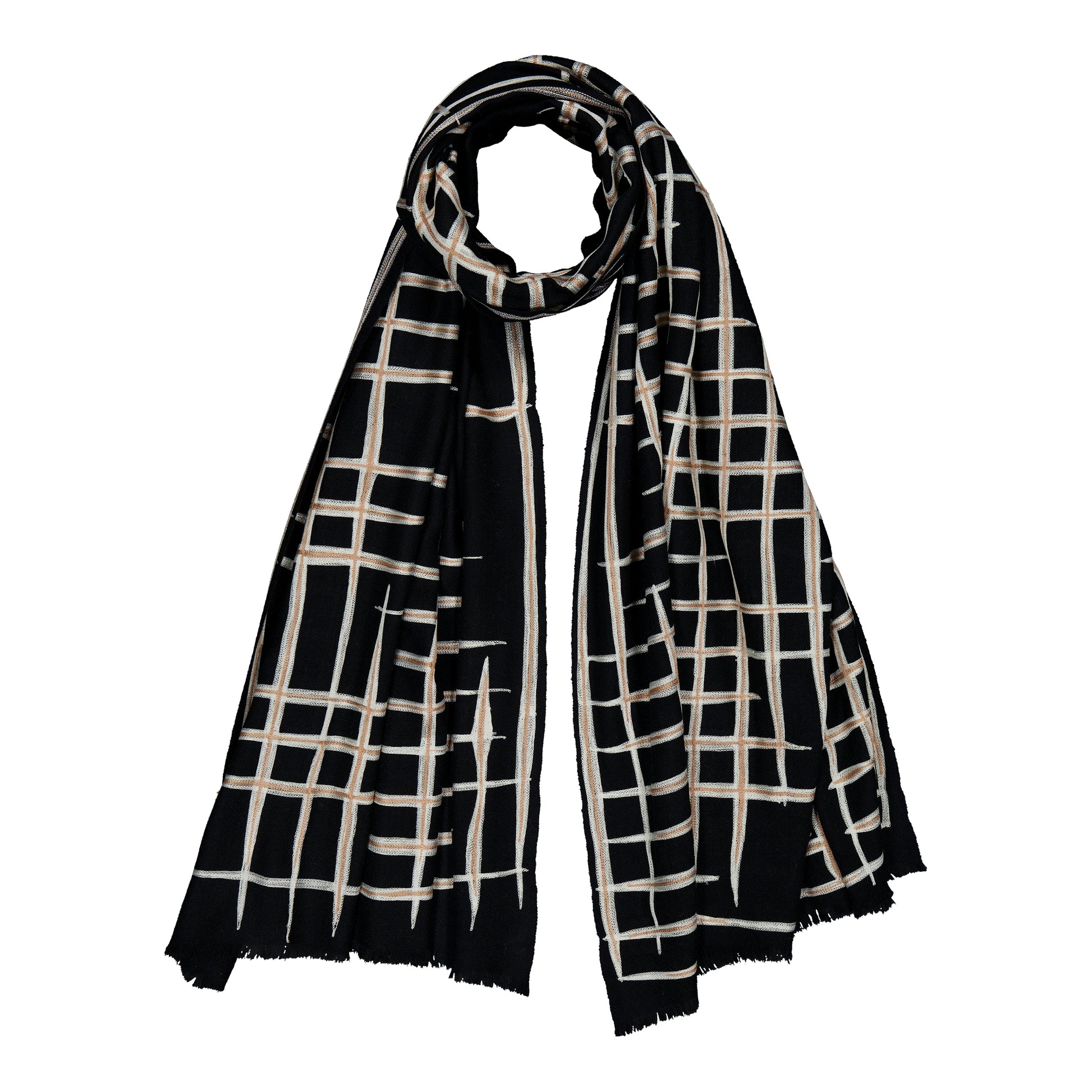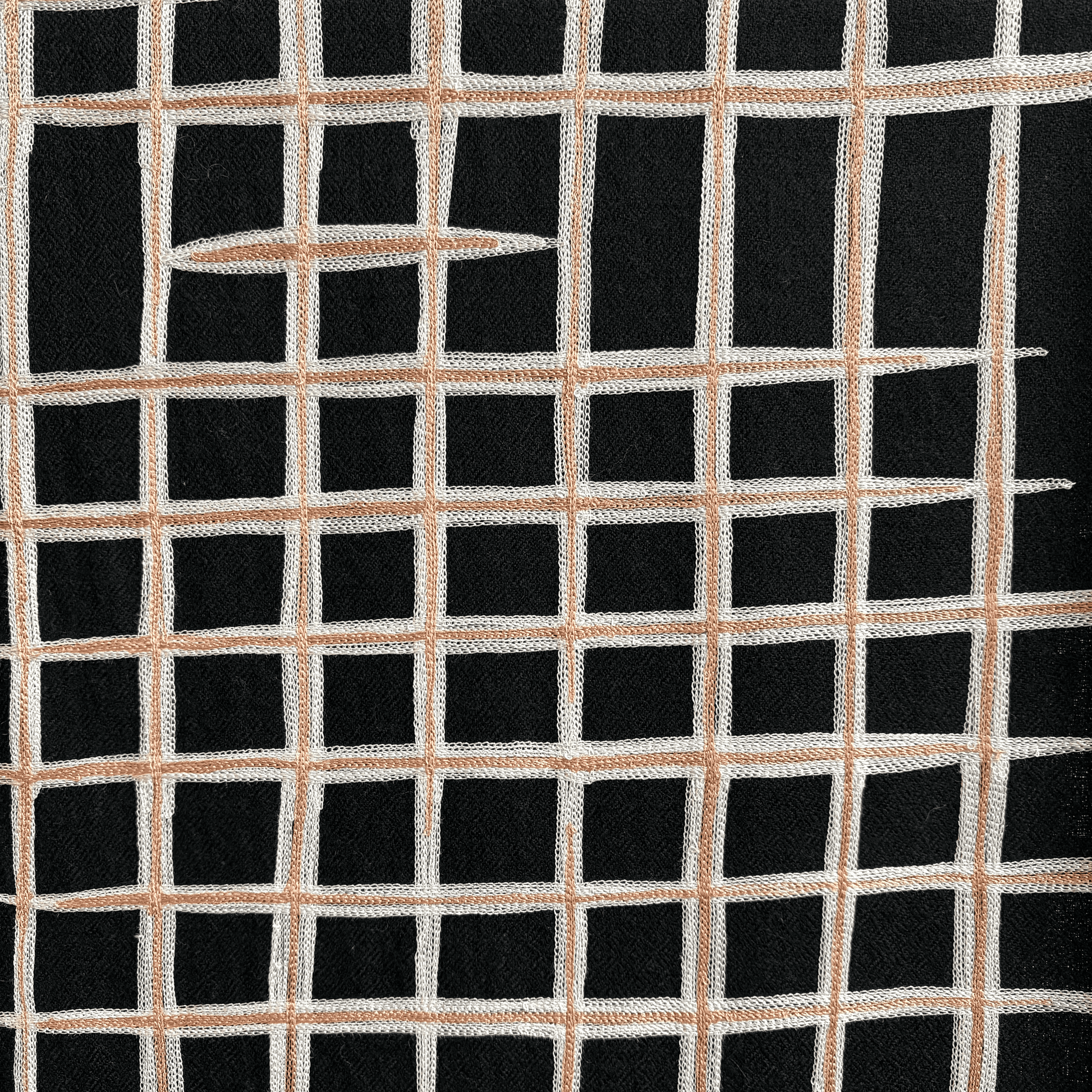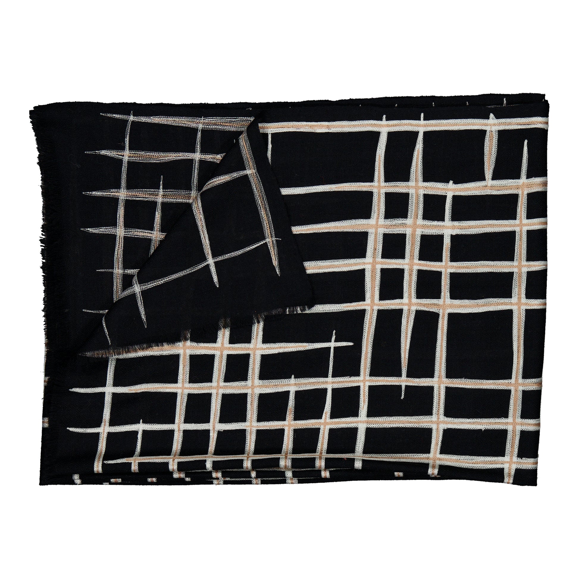 “REPRISE”, étole en laine merino, brodée à Srinagar. Motif tartan. Légèrement effrangé aux extrémités.