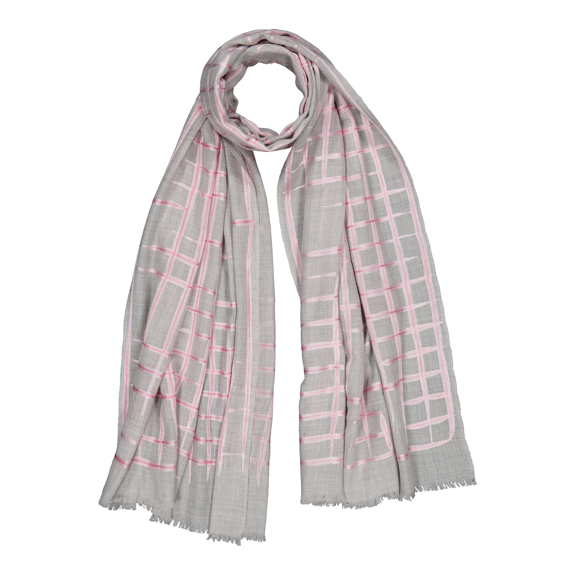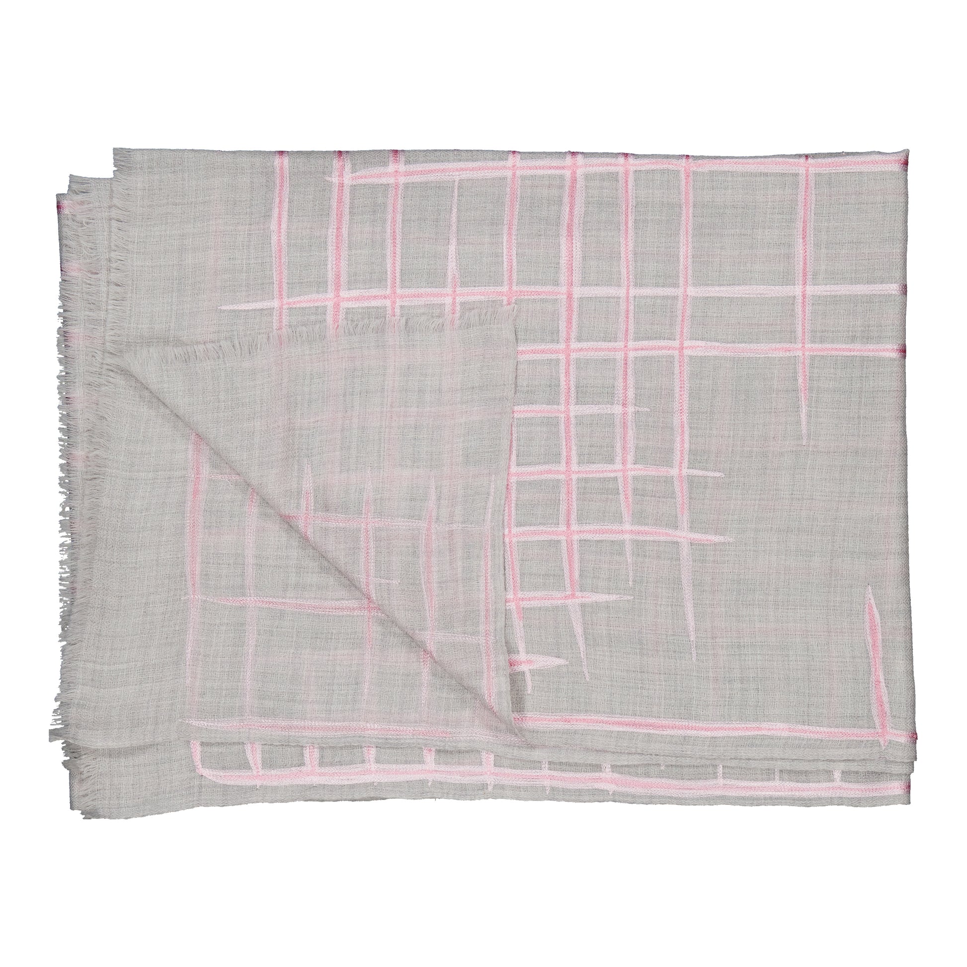 “REPRISE”, étole en laine merino, brodée à Srinagar. Motif tartan. Légèrement effrangé aux extrémités.