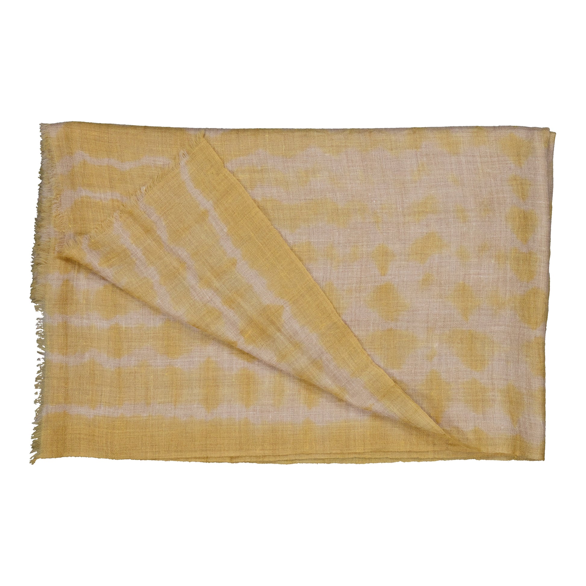 Hand dyed, shibori. Lightly fringed at the bottoms.