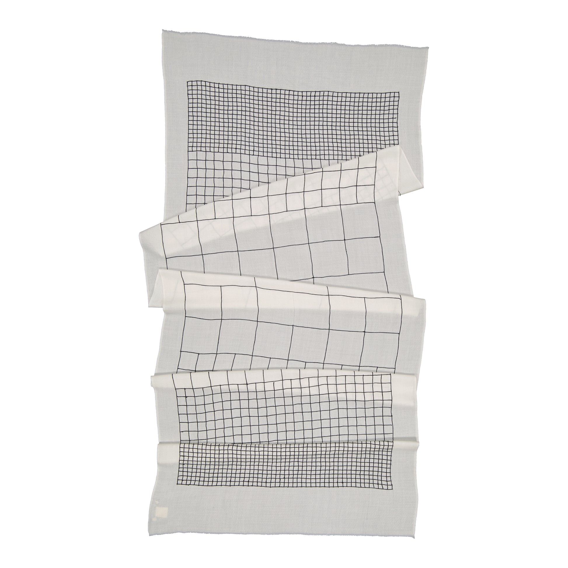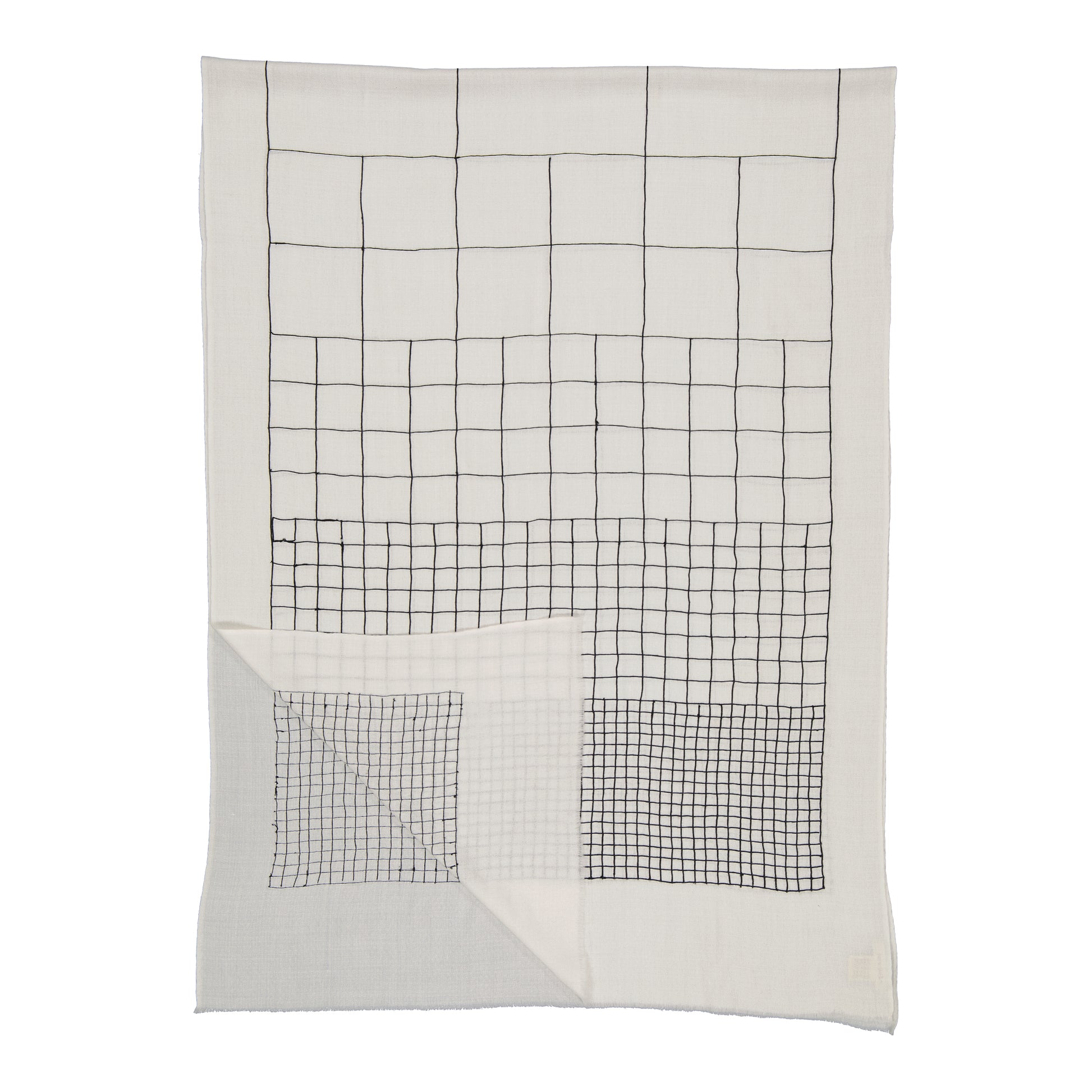 Merino wool scarf, a graphic net is embroidered with chain stitch. Lightly fringed at the edges.