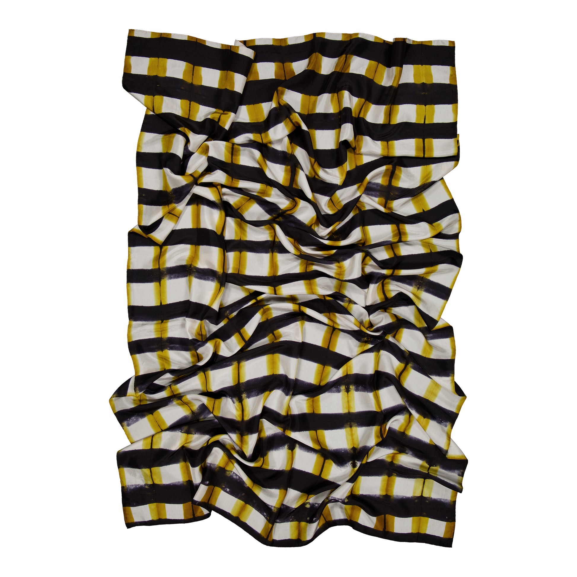 " SINOPLE ", des carreaux aquarellés au caractère affirmé. Un foulard de soie au dessin légèrement aléatoire.