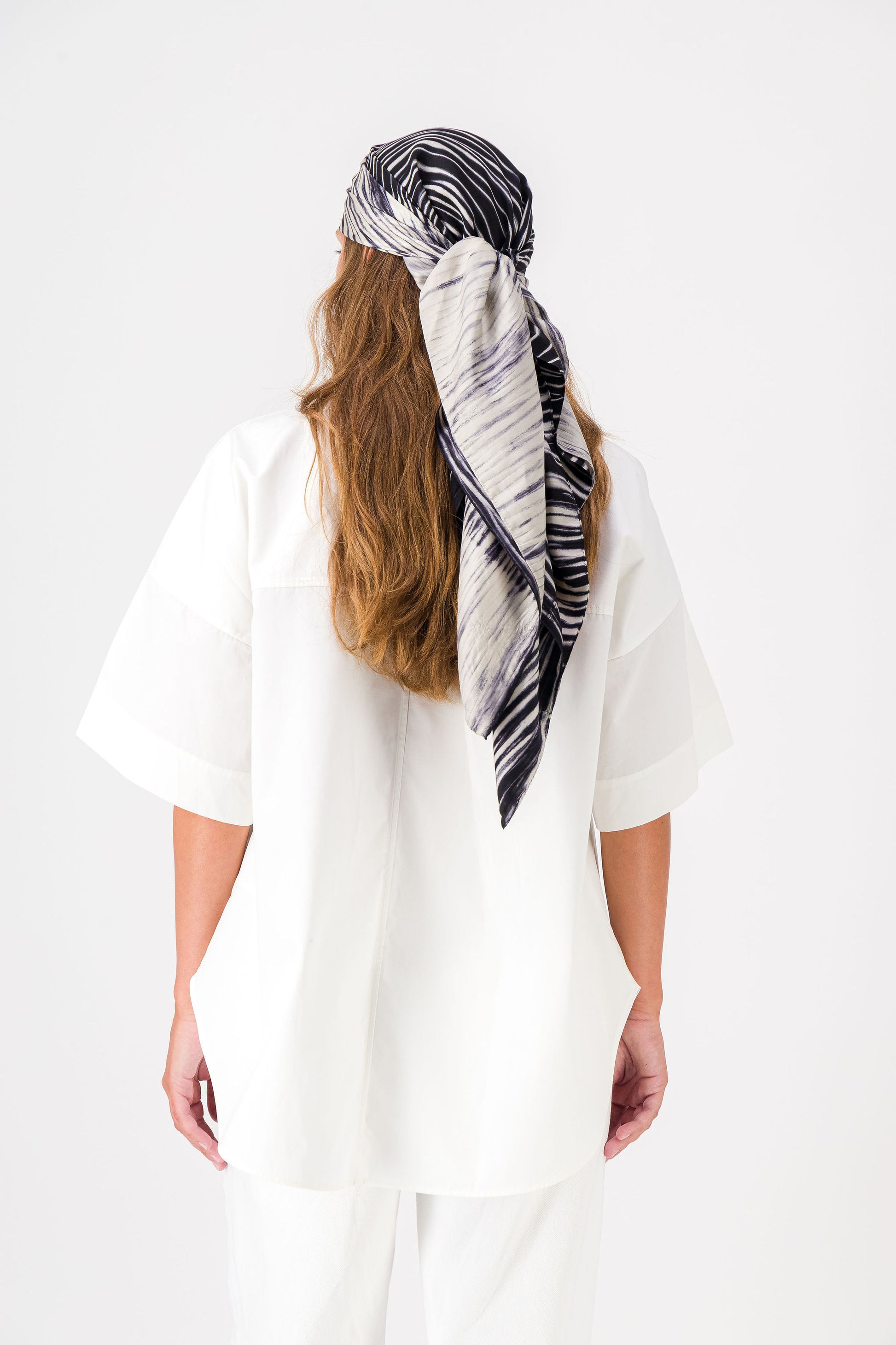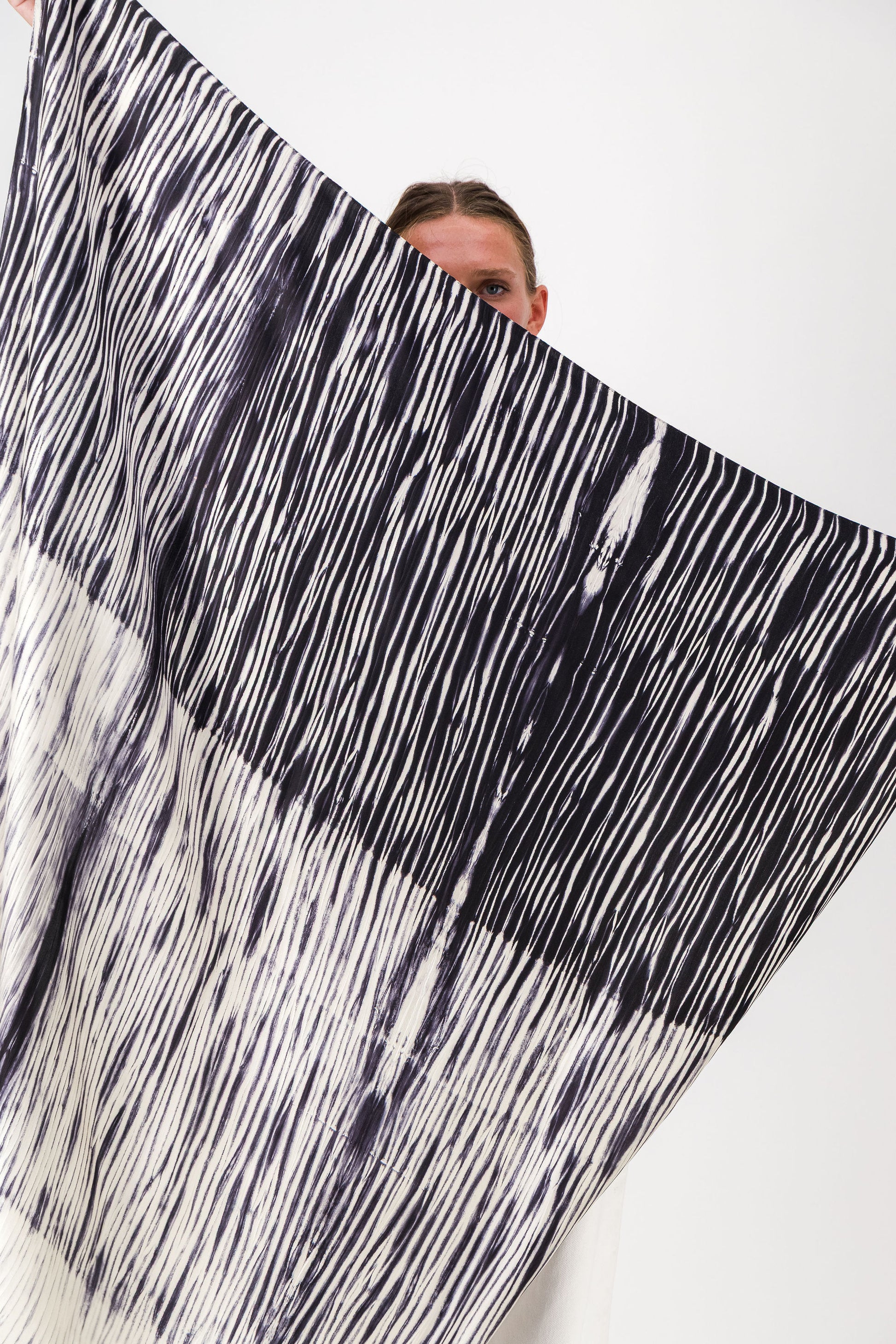 “TRACES”, large carré de soie, réalisé selon une technique de teinture artisanale Arashi shibori